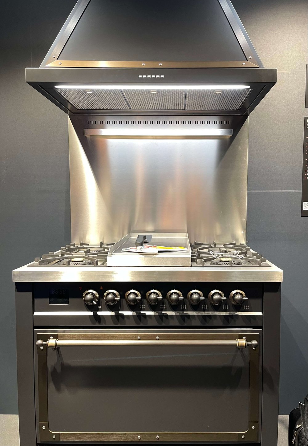 This matte graphite range and hood from Ilve also had a warm bronze strapping finish and then gunmetal gray controls and handle.