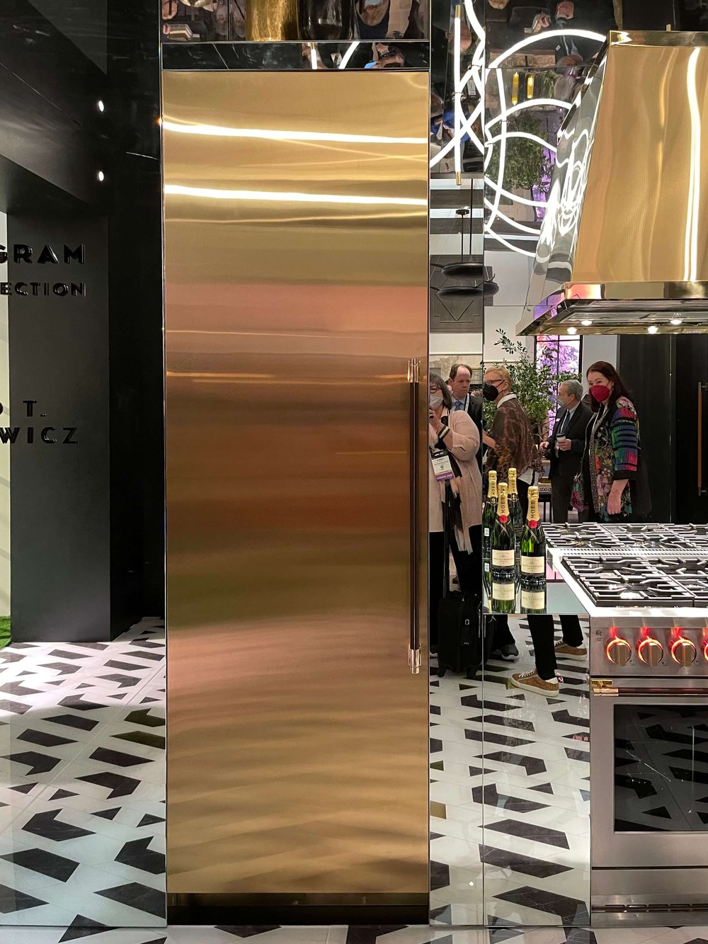 Monogram had a stunning booth, designed by Richard, that featured his new appliance collection. See the mix of the stainless range with the brushed brass hood and refrigerator door panel? That sleek look is perfect for kitchens with taller ceilings these days, as it is a 96” high door panel.