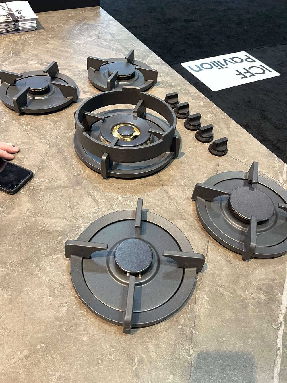 Pitt Cooking had an interesting display. These gas burners can be installed anywhere in a countertop and in any arrangement you want. Install one burner or many. There could even be a remote burner or two installed across the kitchen for a second cook.
