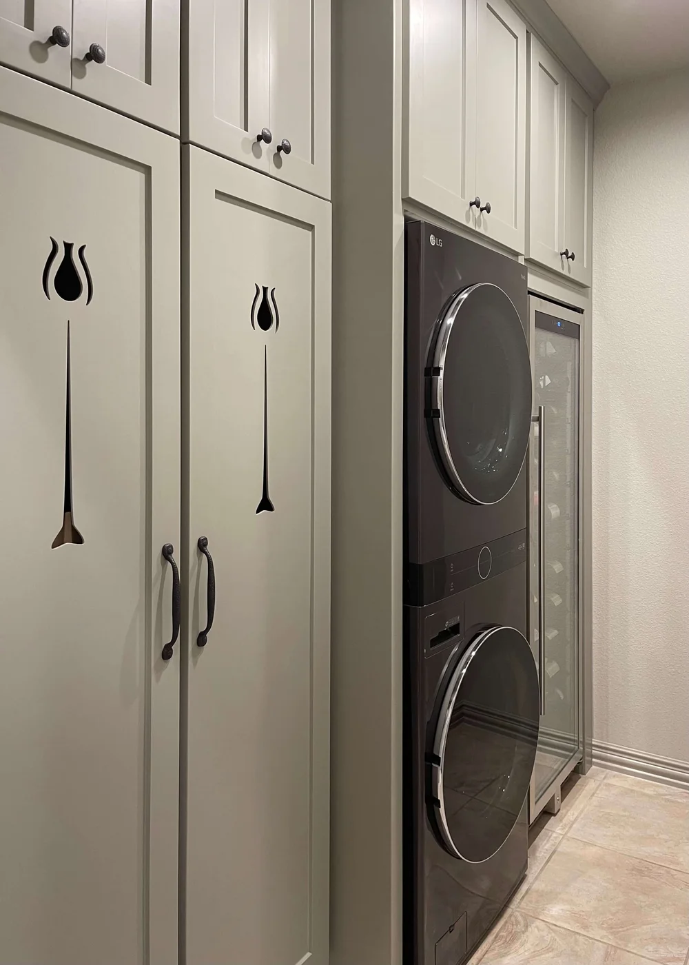 A stacking washer and dryer makes more floor space for full height storage and a wine fridge in this small laundry room. Carla Aston, Designer