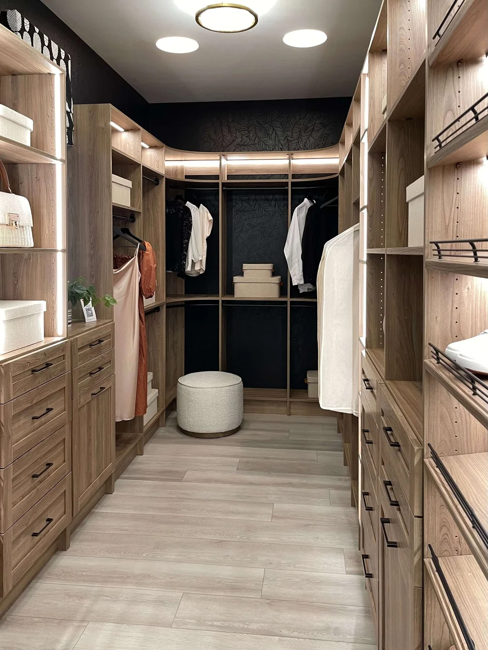 Custom cabinetry and dramatic black wallcovering make for a contemporary closet in The New American Home 2022.