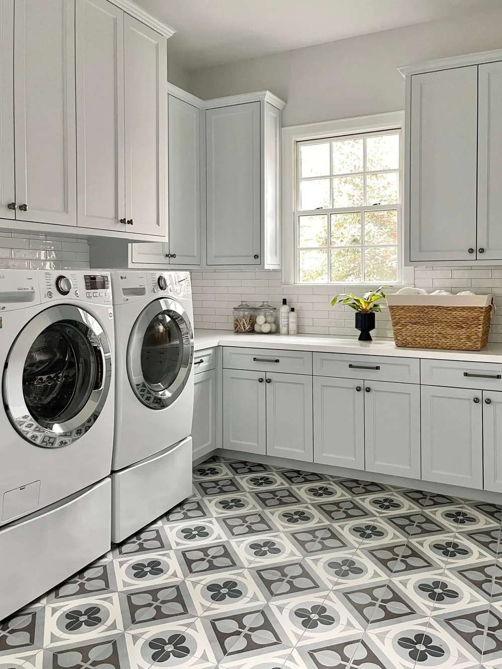 I really love some fun flooring in a room like this, since it is mostly the machines and cabinets. If you have a window, a fun window treatment is always an easy way to add some style.