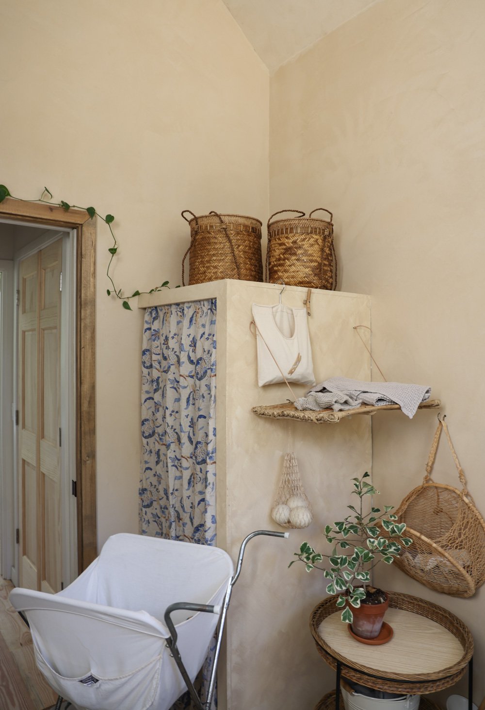 Our shower is one of those spaces. When it’s not in use for bathing, we sometimes pop open a vintage, collapsible drying stand for larger, damp linens beneath the windows and skylights. Another area we reserved for drying out (smaller) textiles was the wall space bordering the stacked washer-dryer. I wanted a fold-down, slated platform for items like still-damp, clean cloth diapers, and freshly washed Swedish dishcloths, but I didn’t want a newly-made plastic or metal rack from a big box retailer. Instead, I went shopping within our home.