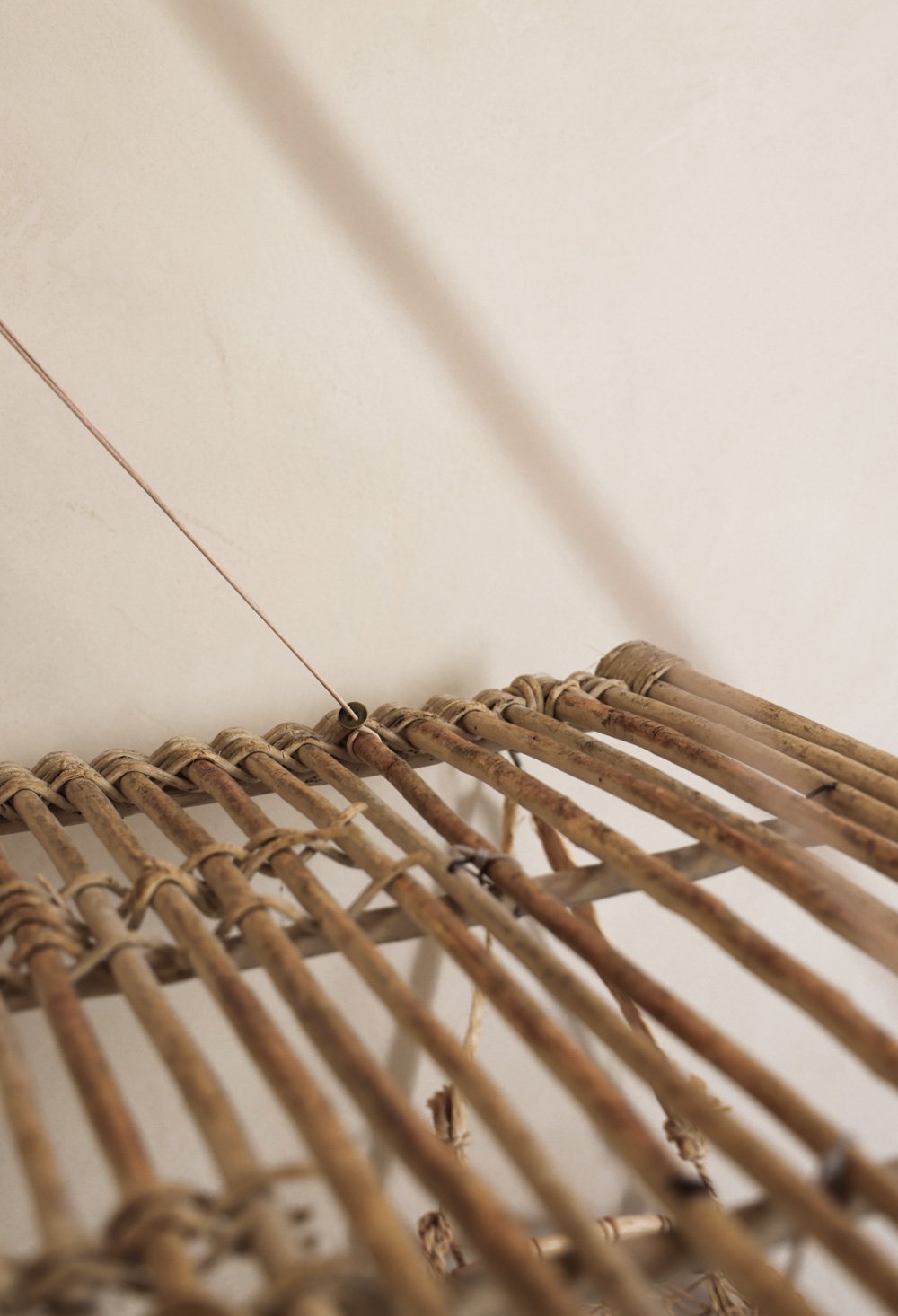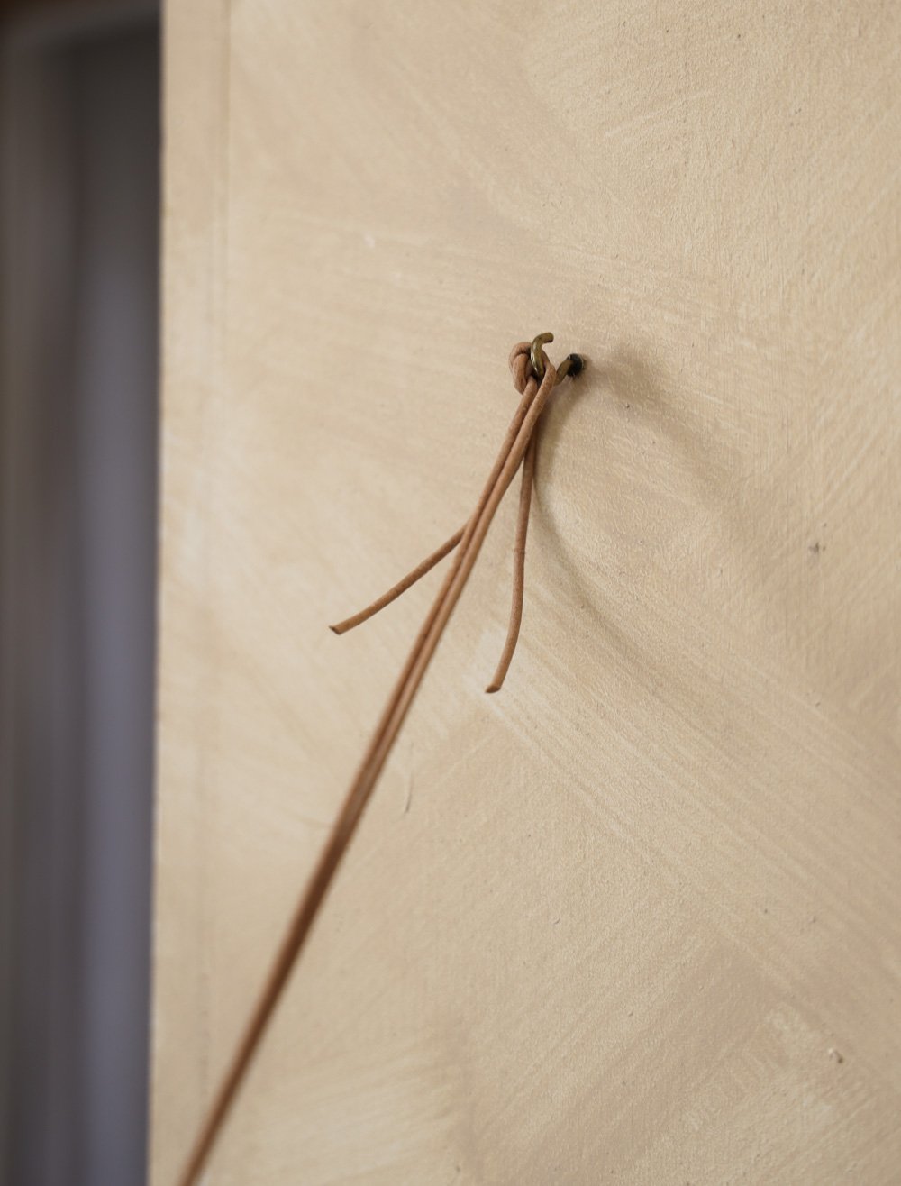 Again, we looked around our home. We found spare mug hooks in various sizes, two leftover chords from a suspended book rack, and a small piece of driftwood— all of which we could put to use to make the rack fold up and stay put, or fold down and support the necessary amount of weight.