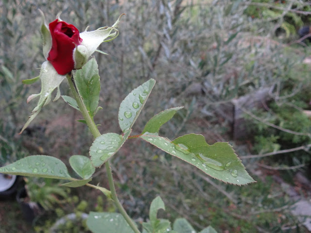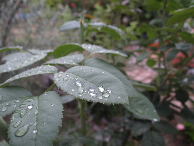 I was surprised in the pre-dawn this morning to see that a sprinkle of rain had fallen - not enough to nourish roots, but certainly enough to provide a pretty raindrop display on the roses.