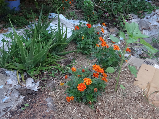 The marigolds have self seeded as well, right beside one of our many clumps of aloe, and boy are they pretty! That's another sunflower beside them...