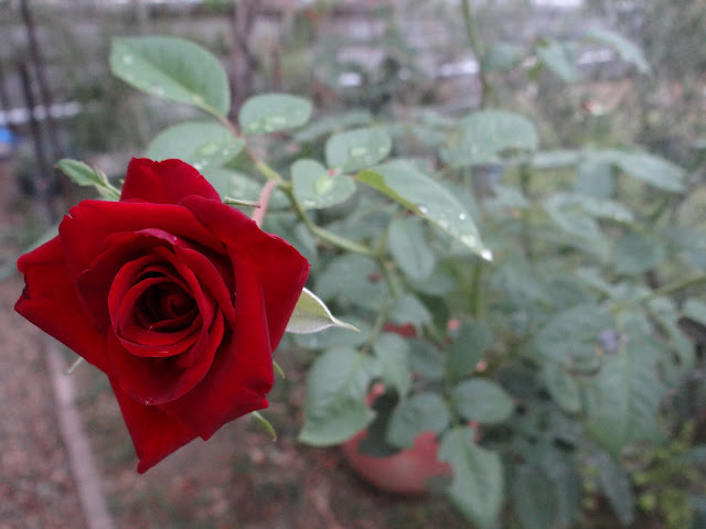 This is my Black Madonna, a long stemmed red rose which I cut for display inside the house. When left too long outside the delicate petals burn to a crisp under our scorching tropical sun, so I always have one, two, or even three small vases of blooms inside.