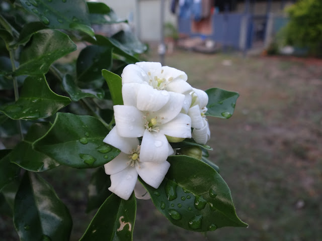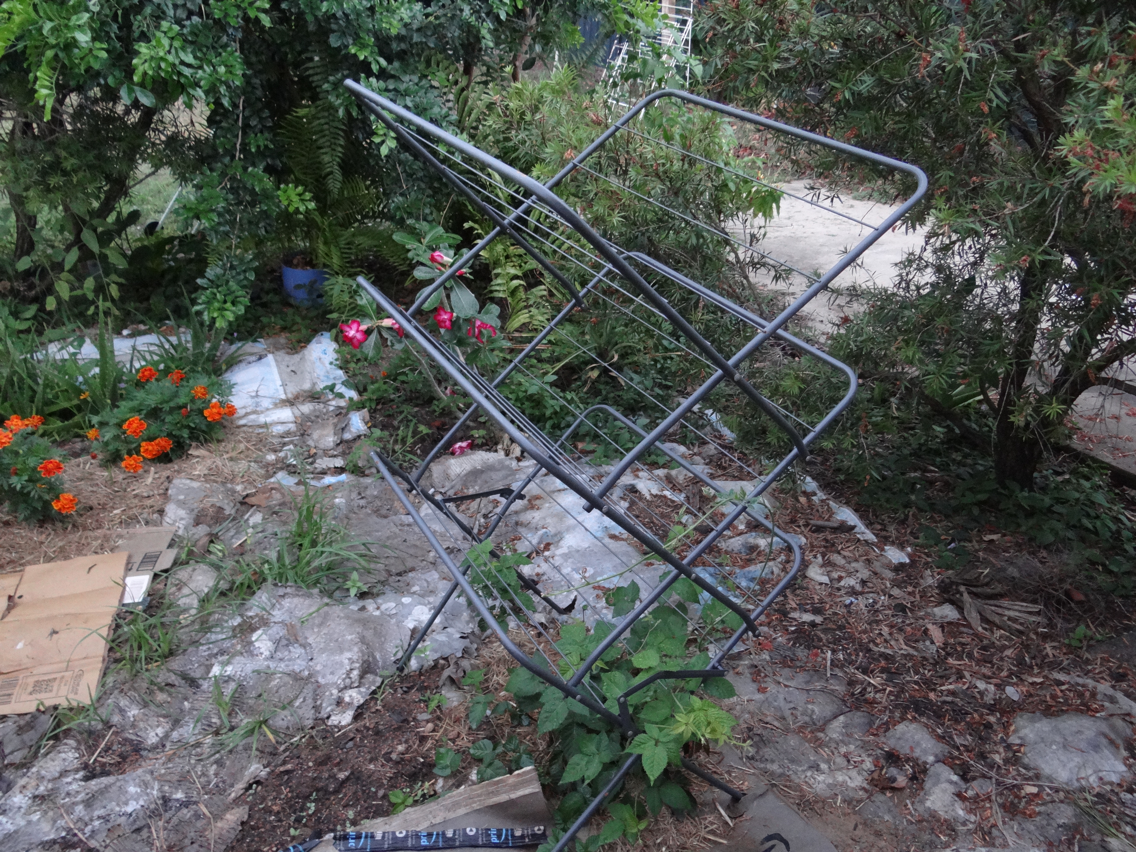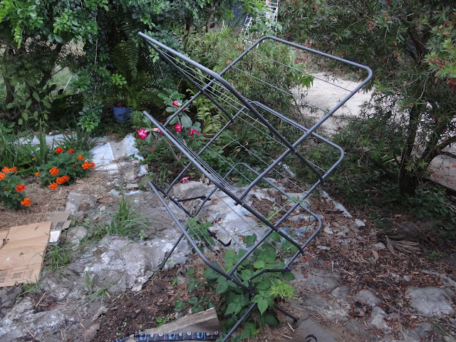 Hubby planted a blackberry bush a few months back, one which apparently does well in the tropics, and after a slow start it's really taken off this past month so we've put an old clothes drying rack over it as a frame to grow across.