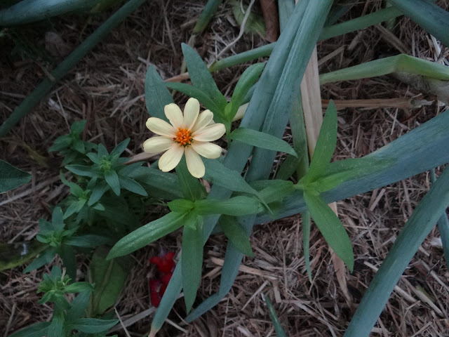 Zinnias are self seeding everywhere, which is a real blessing because I won't need to plant them again, but so funny to see them popping up in pots and garden beds all over the yard. This one came up beside a bed of spring (green) onions.