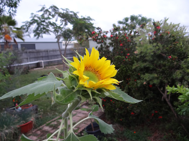 The past few days I've been gently tending a huge sunflower which has been withering badly. It grew near the bird feeder, and as we feed the cockatoos a healthy diet of sunflower seeds each day it was no surprise to see a few of these gorgeous yellow blooms begin to sprout in the ground below, however, they never grow more than two feet high.