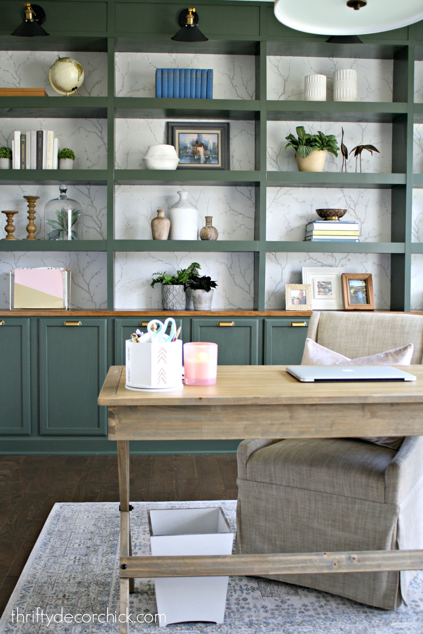 I used this peel and stick cherry blossom design on the backs of the bookcase shelves: