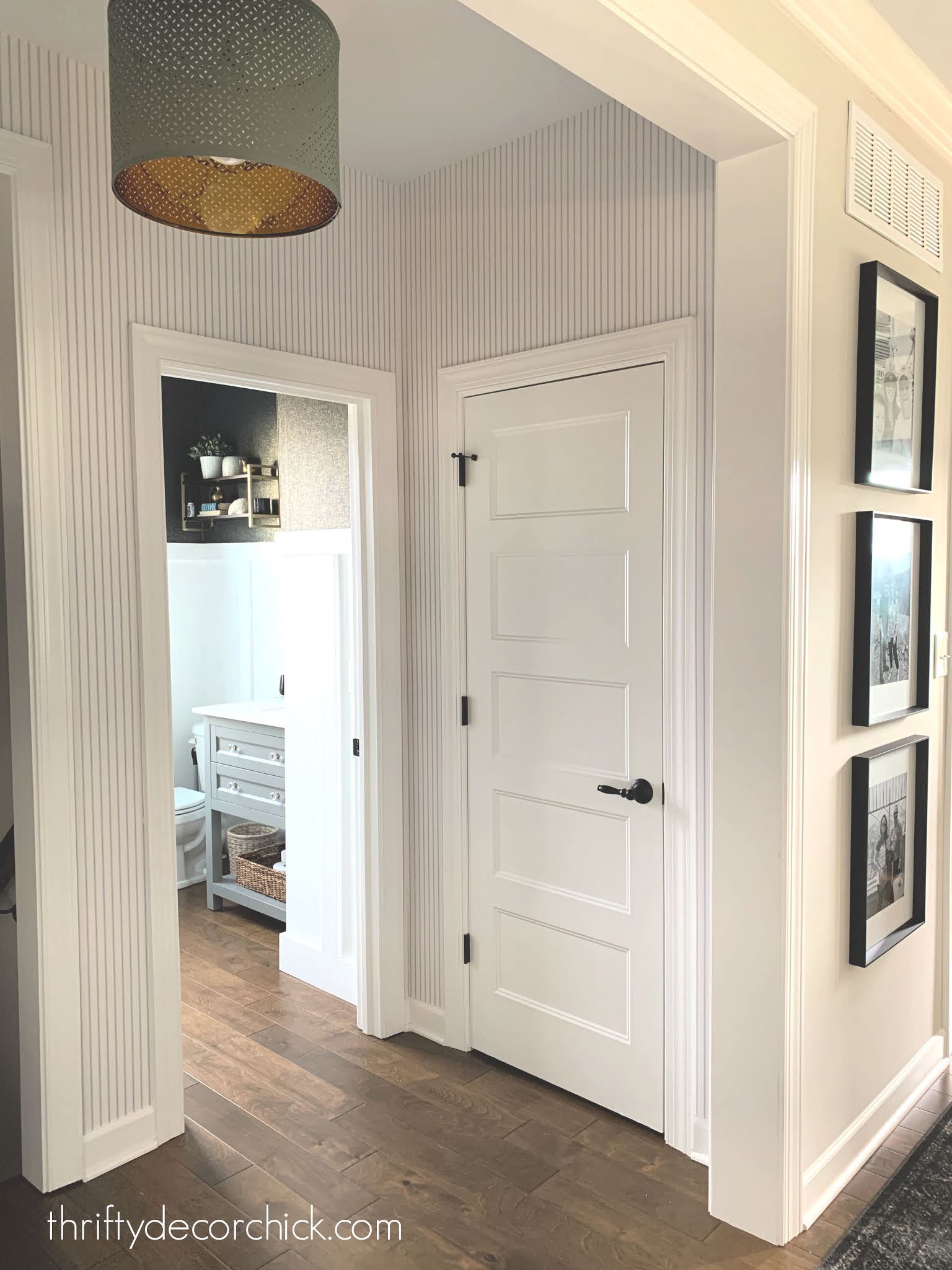 Thankfully the pretty pinstripe design will stand the test of time. I LOVE how this little hallway turned out!: