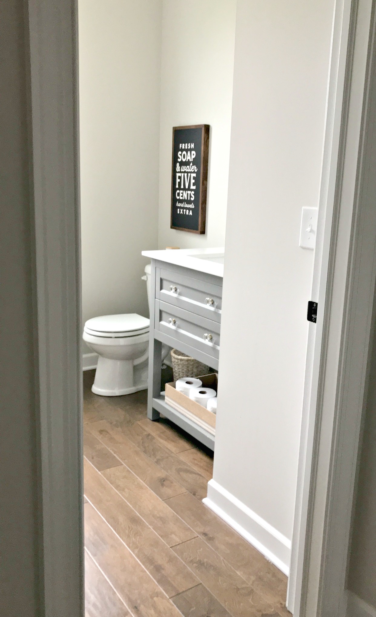 My first go at peel and stick wallpaper was in our powder room. It was pretty bland before: